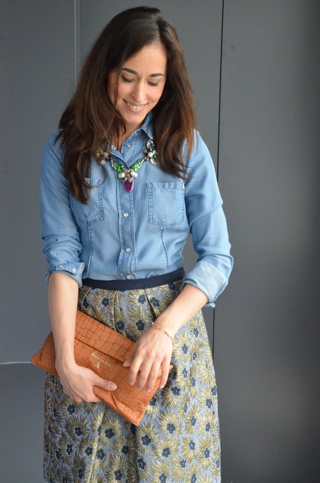 una camicetta in jeans di Patrizia Pepe. La gonna è piuttosto particolare, con