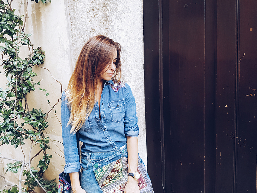 Ho scelto quindi di indossare qualche giorno fa dei capi in denim di Desigual che ho acquistato direttamente sull’ecommerce. Ho realizzato così un total look con camicia sfiancata con ricami sulle spalle e la gonna in jeans incrociata sul davanti completa di decorazioni e paillettes. Per completare il look ho aggiunto una borsa a sacchetto sempre in jeans e coloratissima, con tanto di mini pom pom sul fondo.