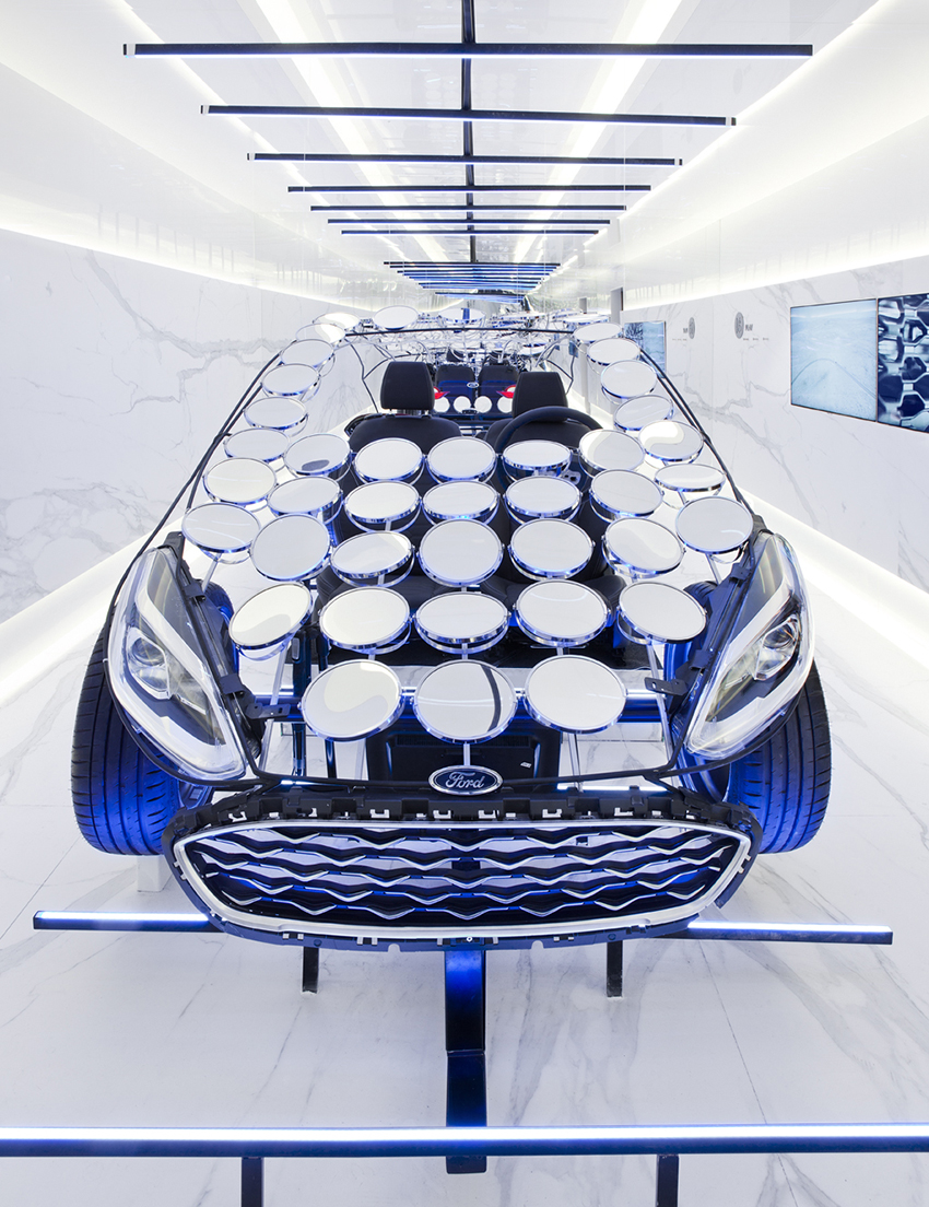 L’architetto Ruiz Velazquez ha concepito una struttura ricoperta di marmi, specchi e Led, al centro della quale troviamo la sagoma di una Ford Festa Vignale, totalmente ricoperta di superfici riflettenti. Il visitatore entra in contatto con questa opera d’arte potendosi sedere all’interno. A completare l’esperienza multisensoriale è un visore 3D che riproduce fedelmente gli interni reali dell’auto. La scelta di usare gli specchi permette inoltre di vedere l’immagine dell’auto più volte riflessa, tanto da sembrare in movimento.