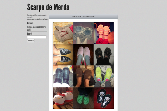 Read MoreQuante volte passeggiando per il centro o seduti al tavolino del bar osservando i passanti avete pensato "che scarpe di m.?" Finalmente è arrivato un blog interamente dedicato a quelle scarpe che ci fanno venire i conati di vomito, quelle scarpe che non capiamo proprio dove siano state acquistate o da quale soffitta siano sbucate e si intitola Scarpe de Merda , scusate il francesismo ma è proprio il nome ...
